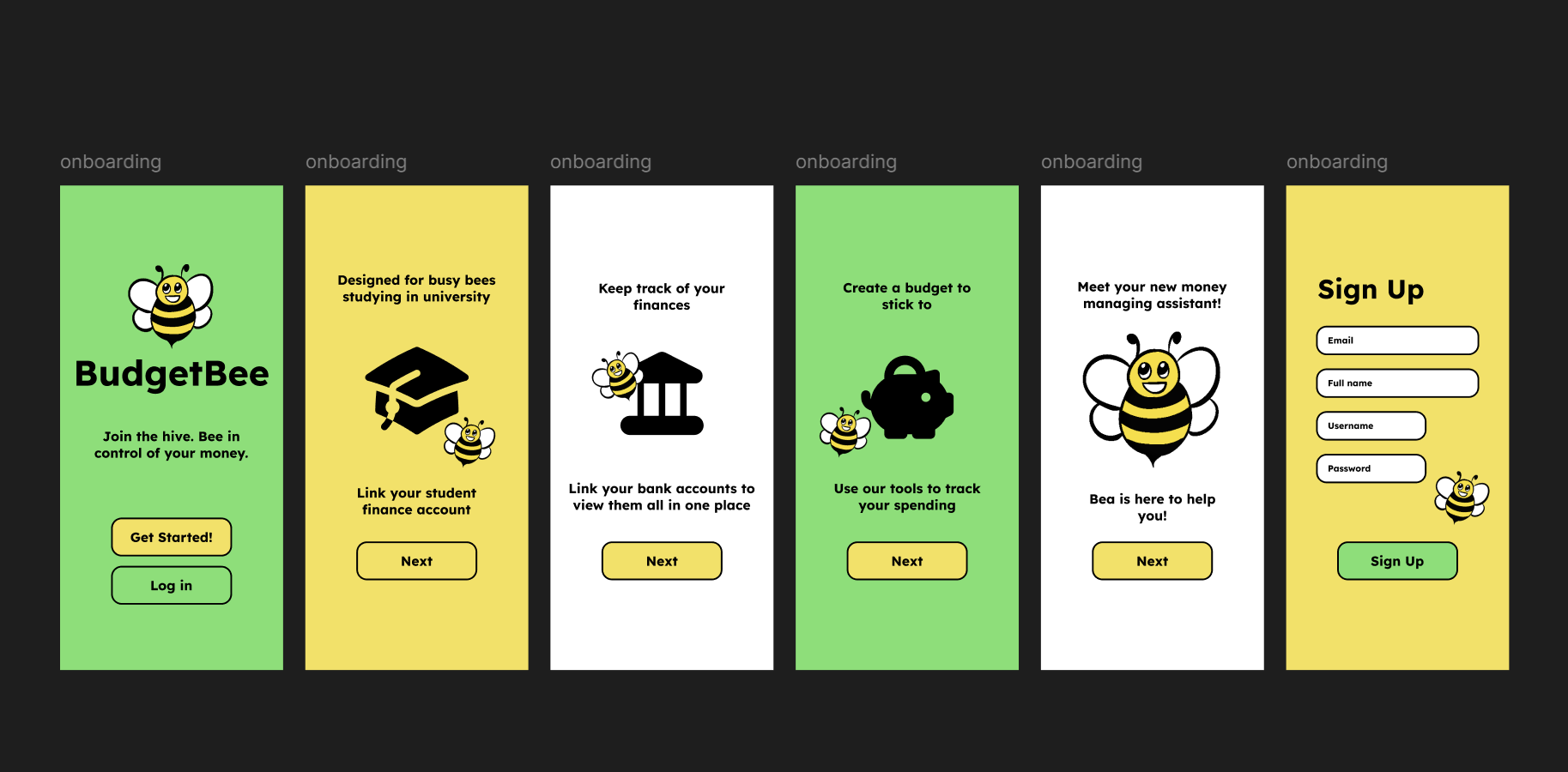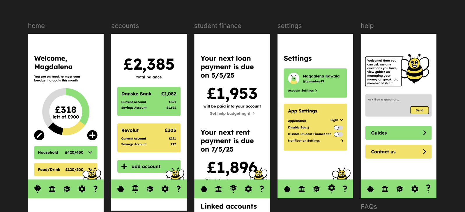 I began the prototyping stage by creating low-fidelity paper wireframes to explore different layouts and information hierarchies. These initial sketches helped me visualize how essential information could be displayed clearly and intuitively. From there, I developed high-fidelity mockups in Figma, focusing on creating a clean, modern design that would be easy to use and accessible. I also decided to create a bee mascot that would function as an AI assisstant to guide you through the experience, and offer help whenever the user needs it. I wanted to use a very fun and lighthearted tone of voice, so I sketched out the bee mascot in a simple style and the colour scheme I used is very simple and bright, spring colours. I created a few onbarding screens to explain the app and then every main screen. The bee mascot animated smoothly between each screen, giving the appearence that it's flying.